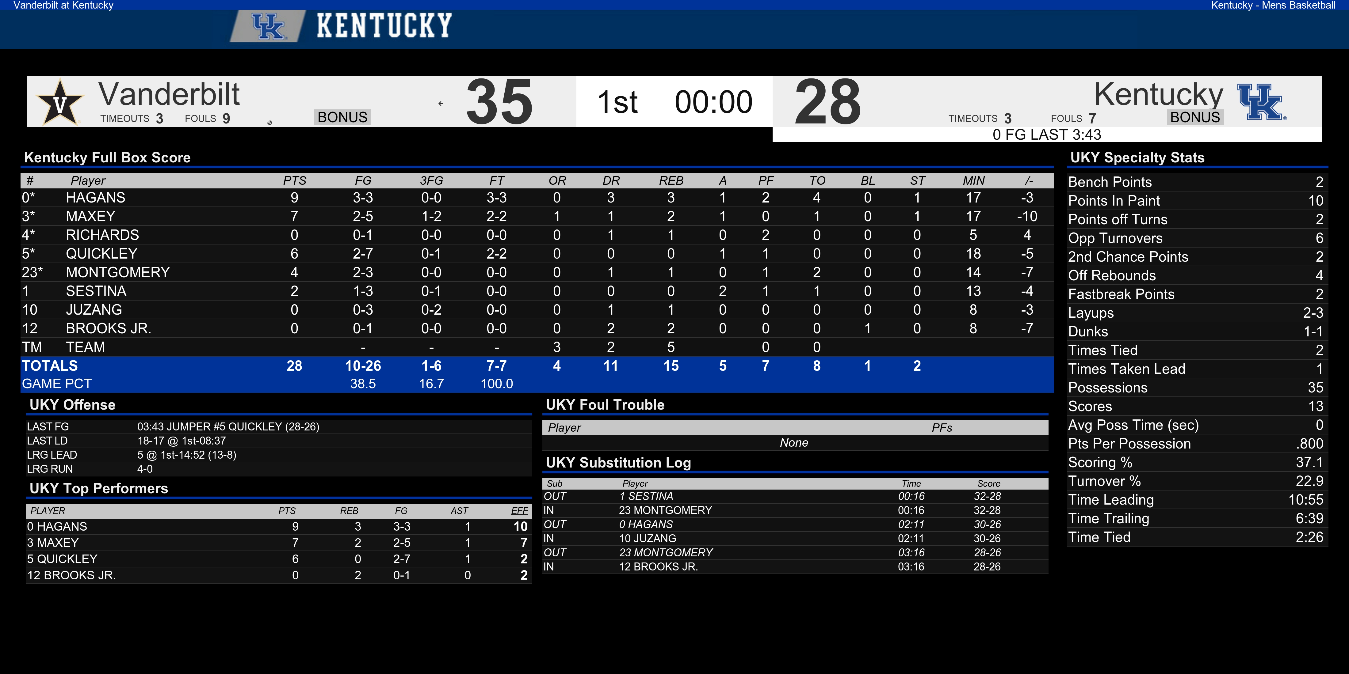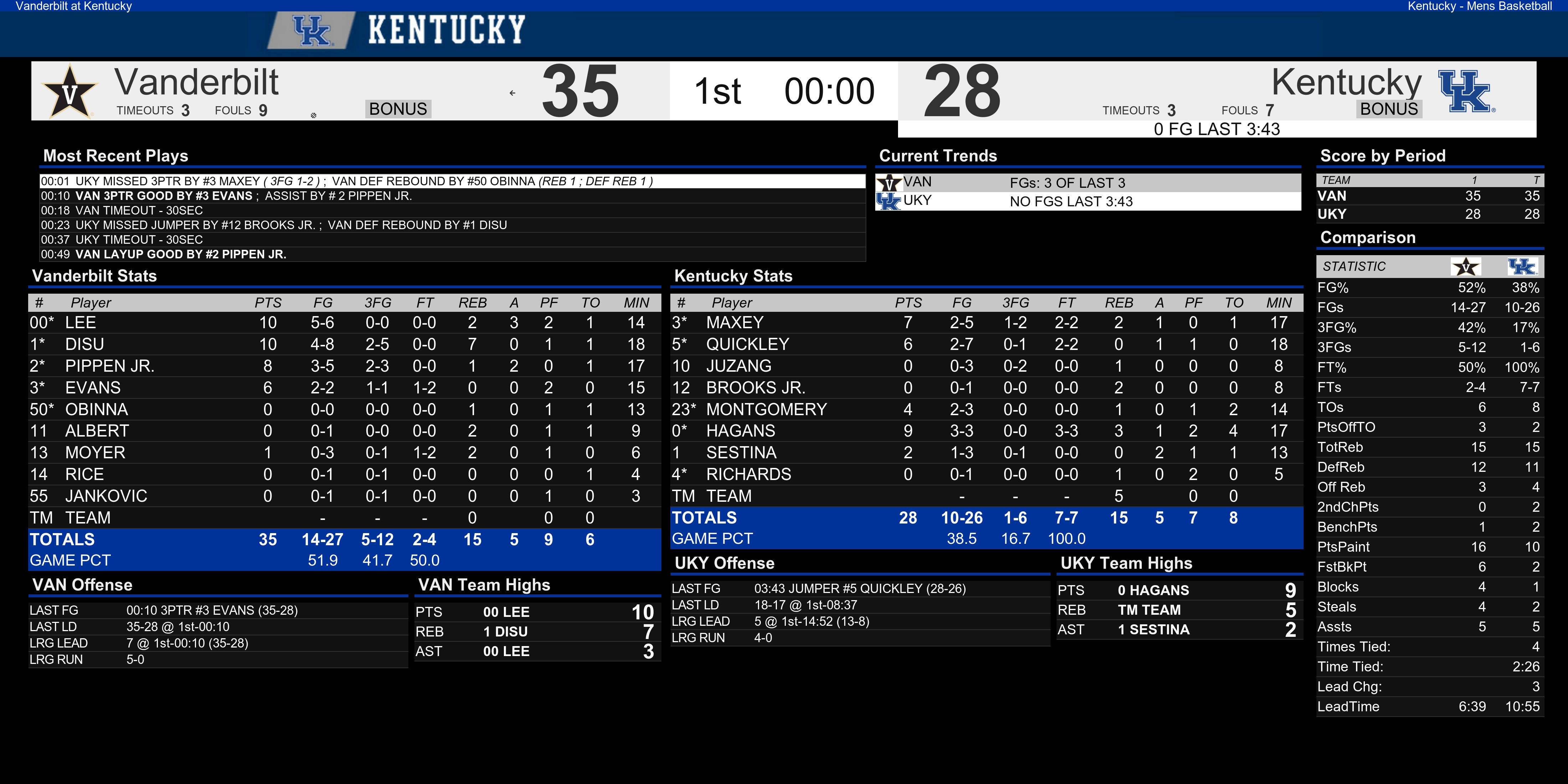 Basketball Cooper Tickets Halftime Boxscore: Kentucky vs. Vanderbilt By Nation of Blue Posted on Jan 29, 2020 Share Tweet Share Share Email Comments Kentucky trails Vandy 35-28 at the half. Here is a look at the first half stats brought to you by Cooper Tickets. Related Items:BBN Share Tweet Share Share Email