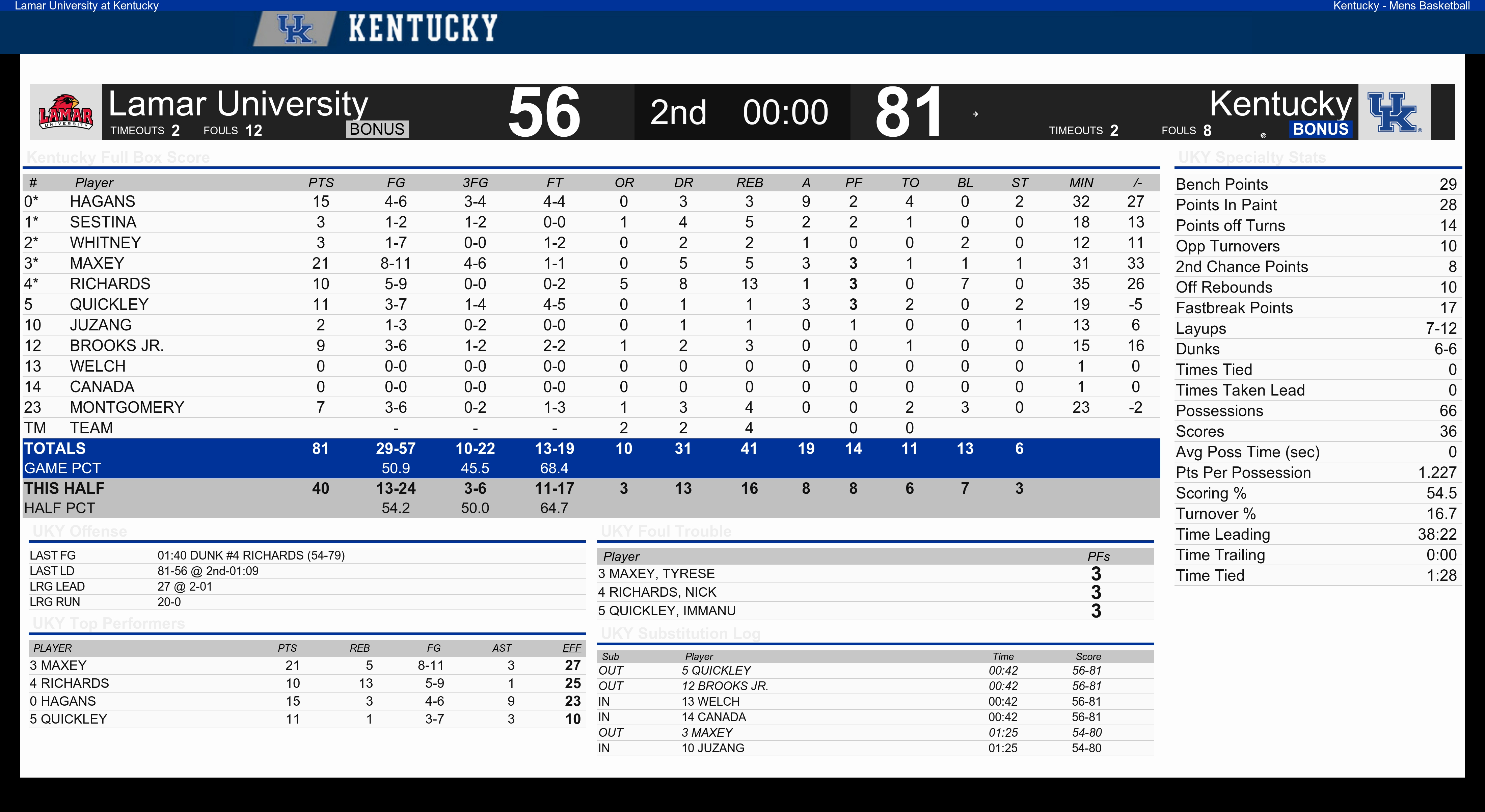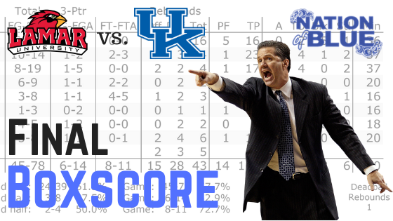 Basketball Final Boxscore: Kentucky vs. Lamar By Chad Pugh Posted on Nov 24, 2019 Share Tweet Share Share Email Comments Here is a look at the final stats for Kentucky’s 81-56 win over Lamar. Related Items:BBN, final boxscore, kentucky basketball Share Tweet Share Share Email