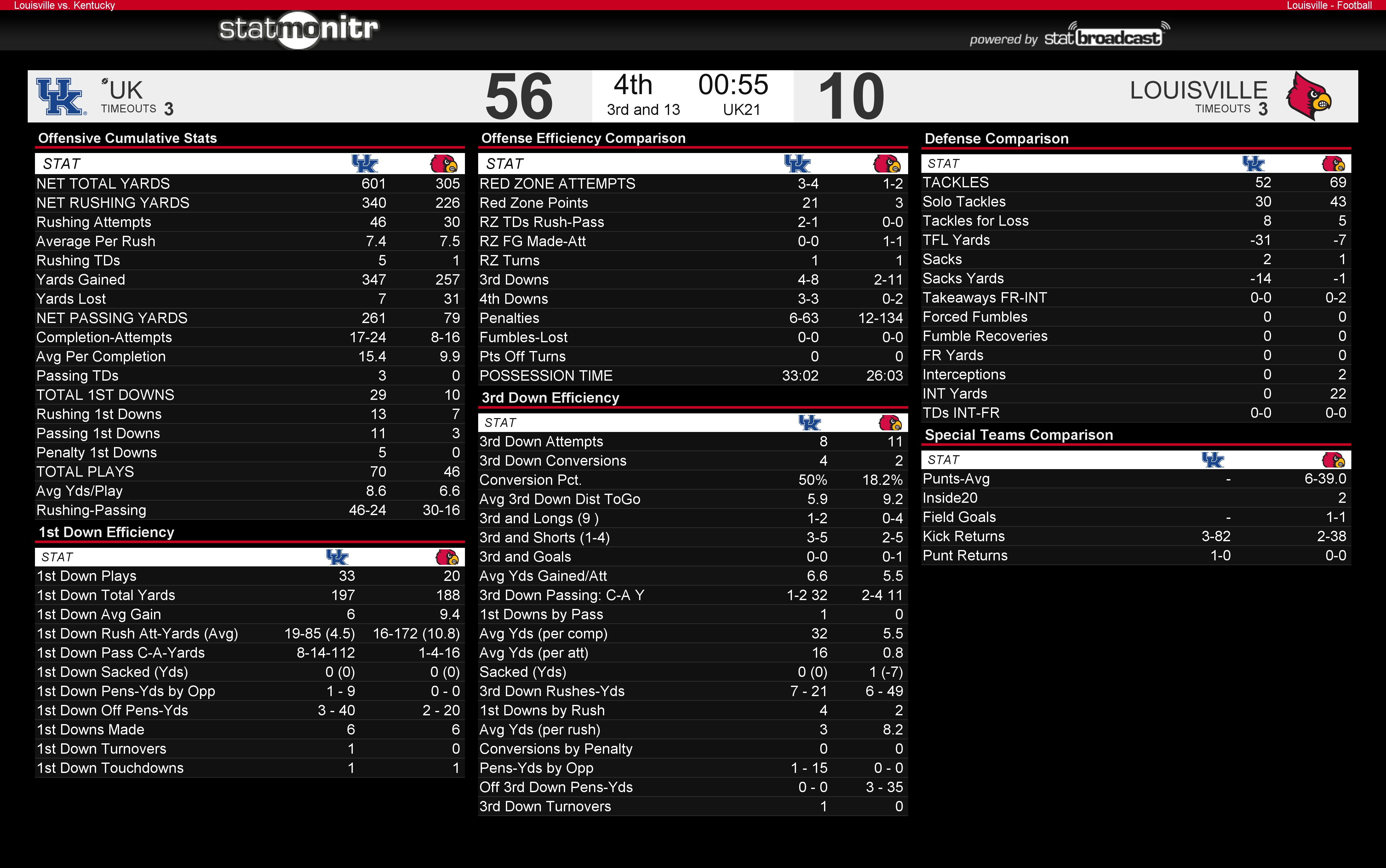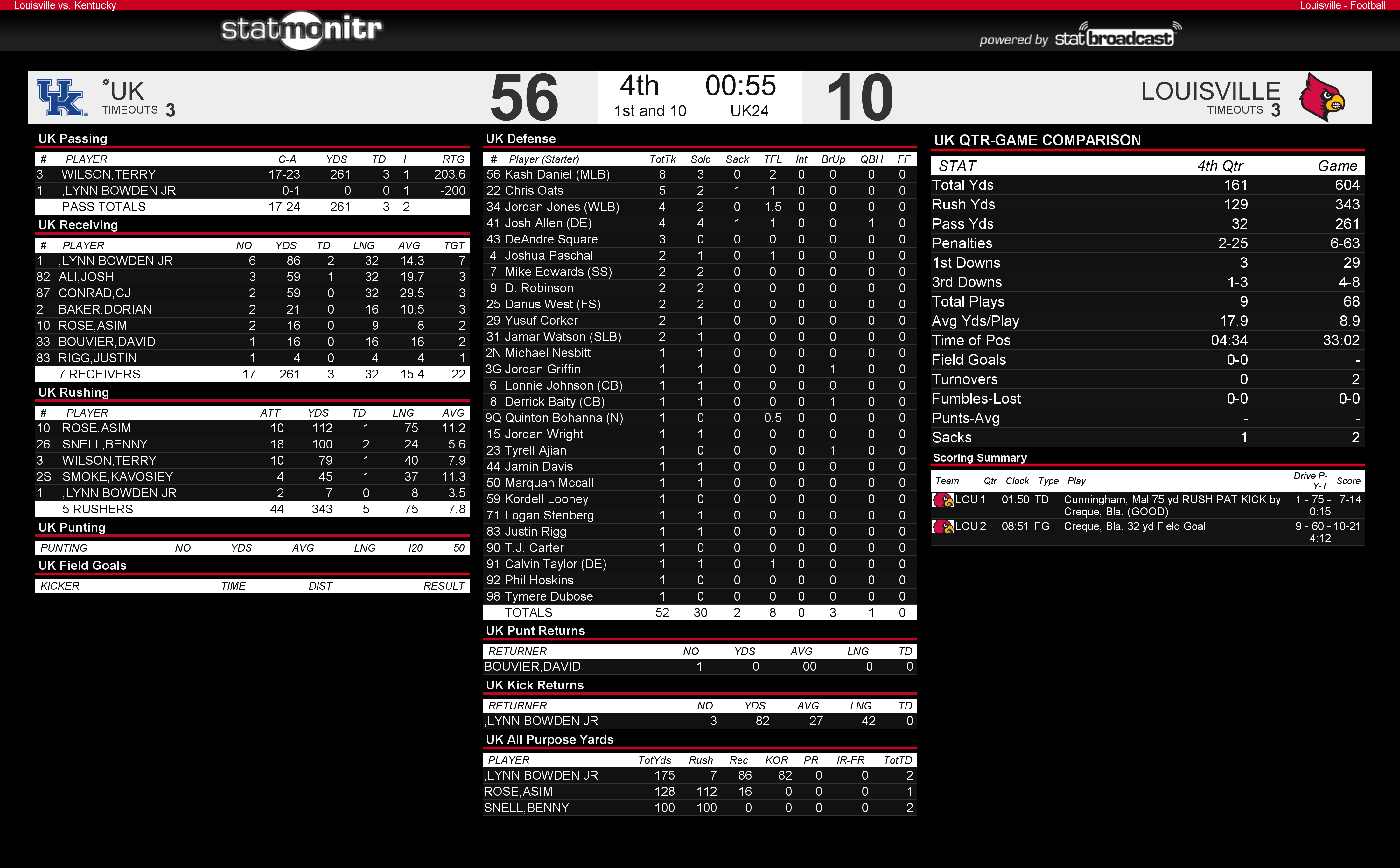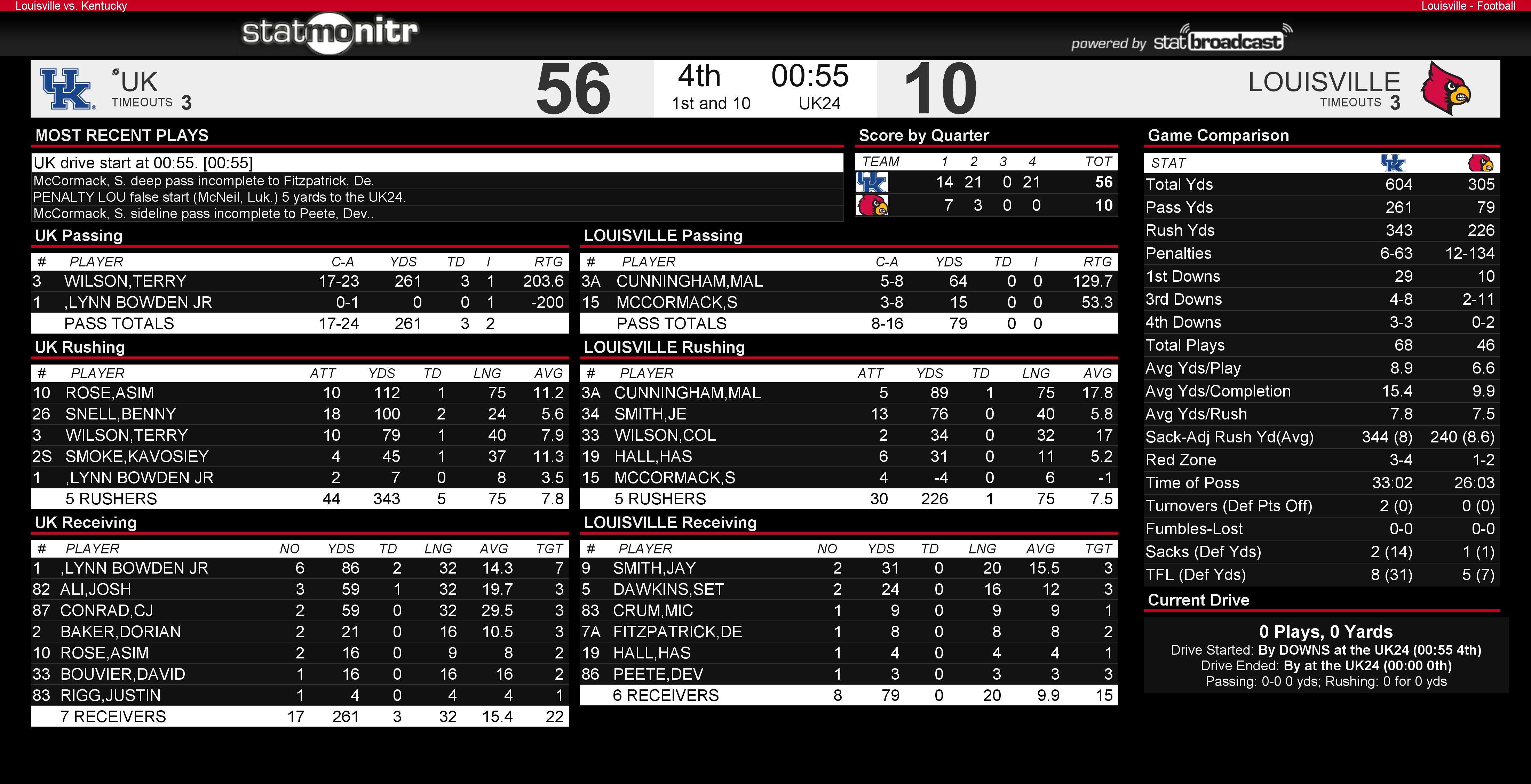 Football Final Boxscore: Kentucky vs. Louisville By Chad Pugh Posted on Nov 24, 2018 Share Tweet Share Share Email Comments Here is a look at the final stats for Kentucky’s 56-10 blowout win over Louisville. Related Items:BBN, final boxscore, kentucky football, louisville football, mark stoops Share Tweet Share Share Email