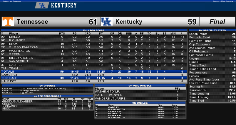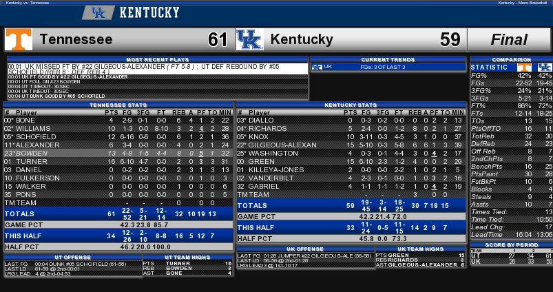 Basketball Final Boxscore: Kentucky vs. Tennessee By Chad Pugh Posted on Feb 6, 2018 Share Tweet Share Share Email Comments Here is a look at the final stats for Kentucky’s 61-59 loss to Tennessee. Related Items:BBN, final boxscore, john calipari, kentucky basketball, tennessee basketball Share Tweet Share Share Email