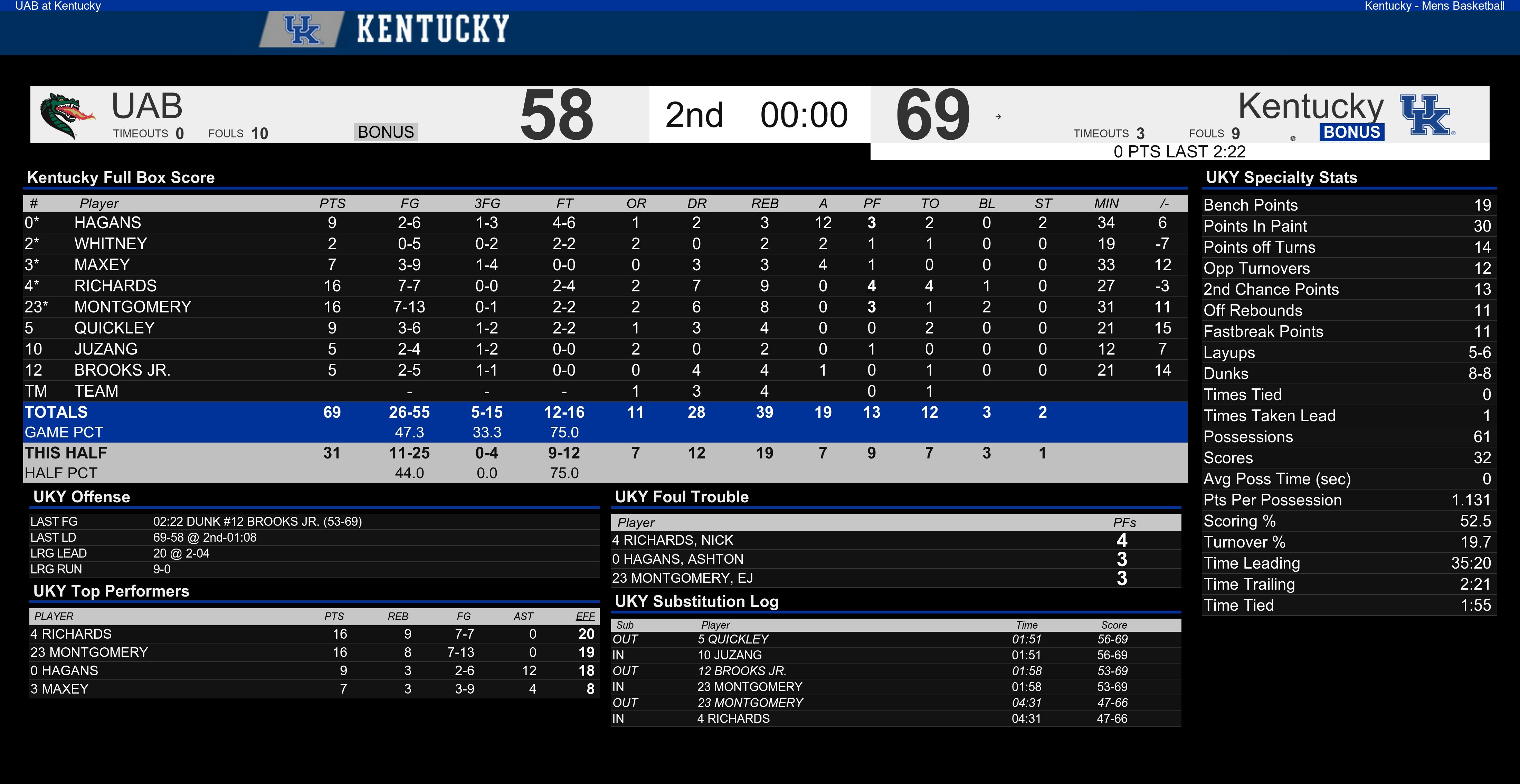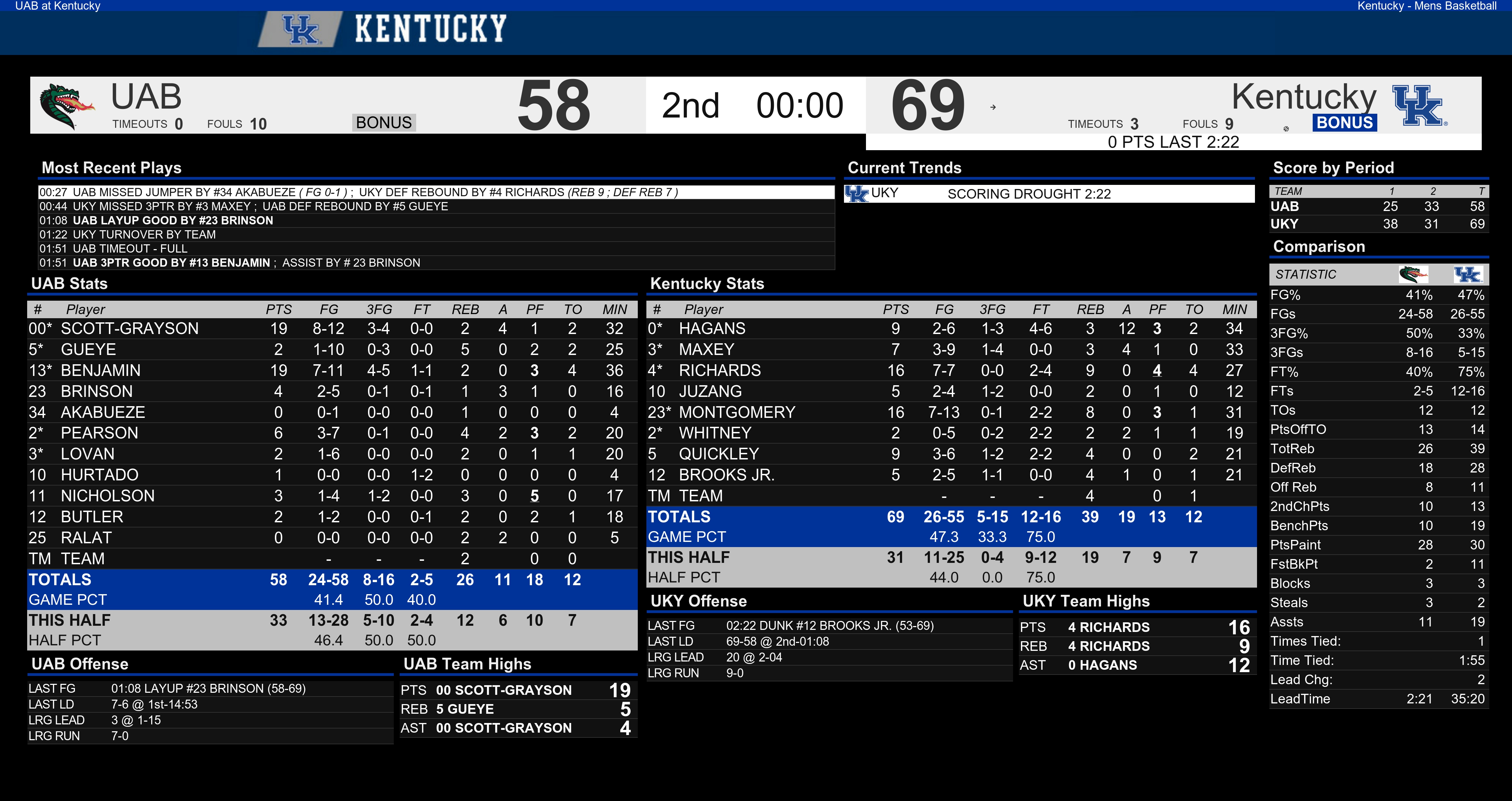 Basketball Final Boxscore: Kentucky vs. UAB By Chad Pugh Posted on Nov 29, 2019 Share Tweet Share Share Email Comments Here is a look at the final stats for Kentucky’s 69-58 win over UAB. Related Items:BBN, final boxscore, kentucky basketball Share Tweet Share Share Email