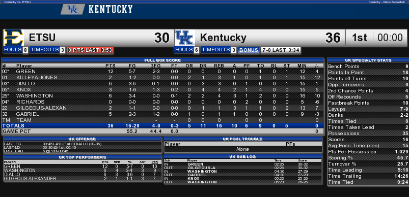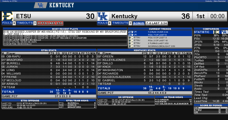 Basketball Halftime Boxscore: Kentucky vs. ETSU By Chad Pugh Posted on Nov 17, 2017 Share Tweet Share Share Email Comments Kentucky leads ETSU 36-30 at the half. Here is a look at the first half stats. Related Items:BBN, east tennessee state basketball, Halftime Boxscore, john calipari, kentucky basketball Share Tweet Share Share Email