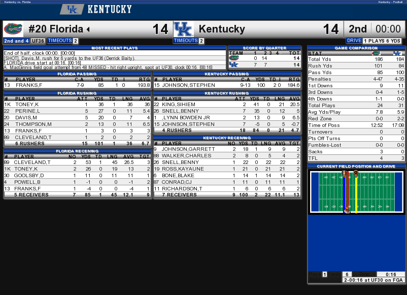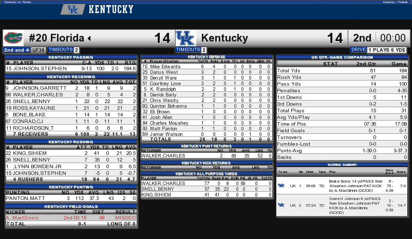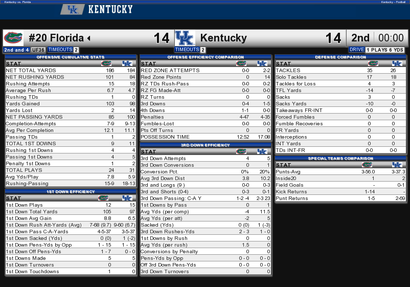 Football Halftime Boxscore: Kentucky vs. Florida By Chad Pugh Posted on Sep 23, 2017 Share Tweet Share Share Email Comments Kentucky and Florida are tied 14-14 at the half. Here is a look at the first half stats. Related Items:BBN, florida football, Halftime Boxscore, kentucky football, mark stoops Share Tweet Share Share Email