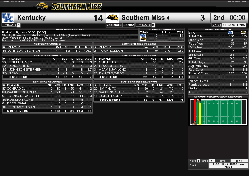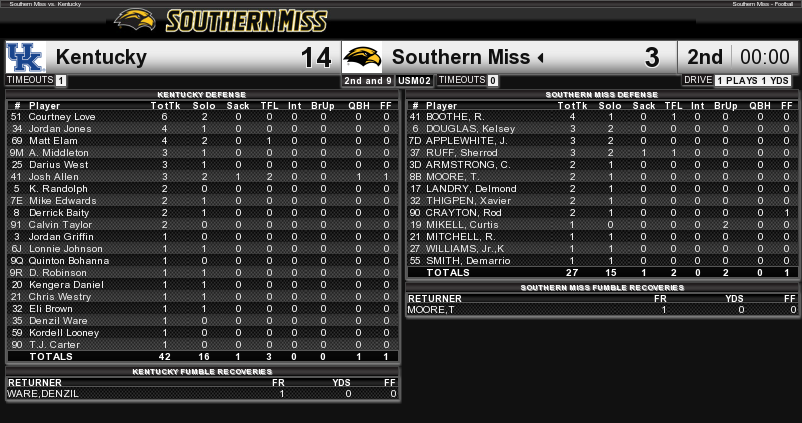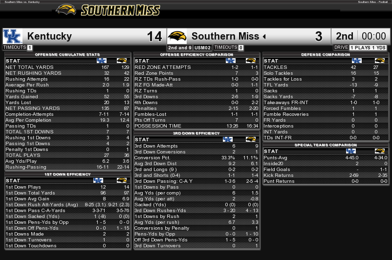 Football Halftime Boxscore: Kentucky vs. Southern Miss By Chad Pugh Posted on Sep 2, 2017 Share Tweet Share Share Email Comments Kentucky leads Southern Miss 14-3 at the half. Here is a look at the first half stats. Related Items:BBN, Halftime Boxscore, Jay Hopson, kentucky football, mark stoops, southern miss football Share Tweet Share Share Email
