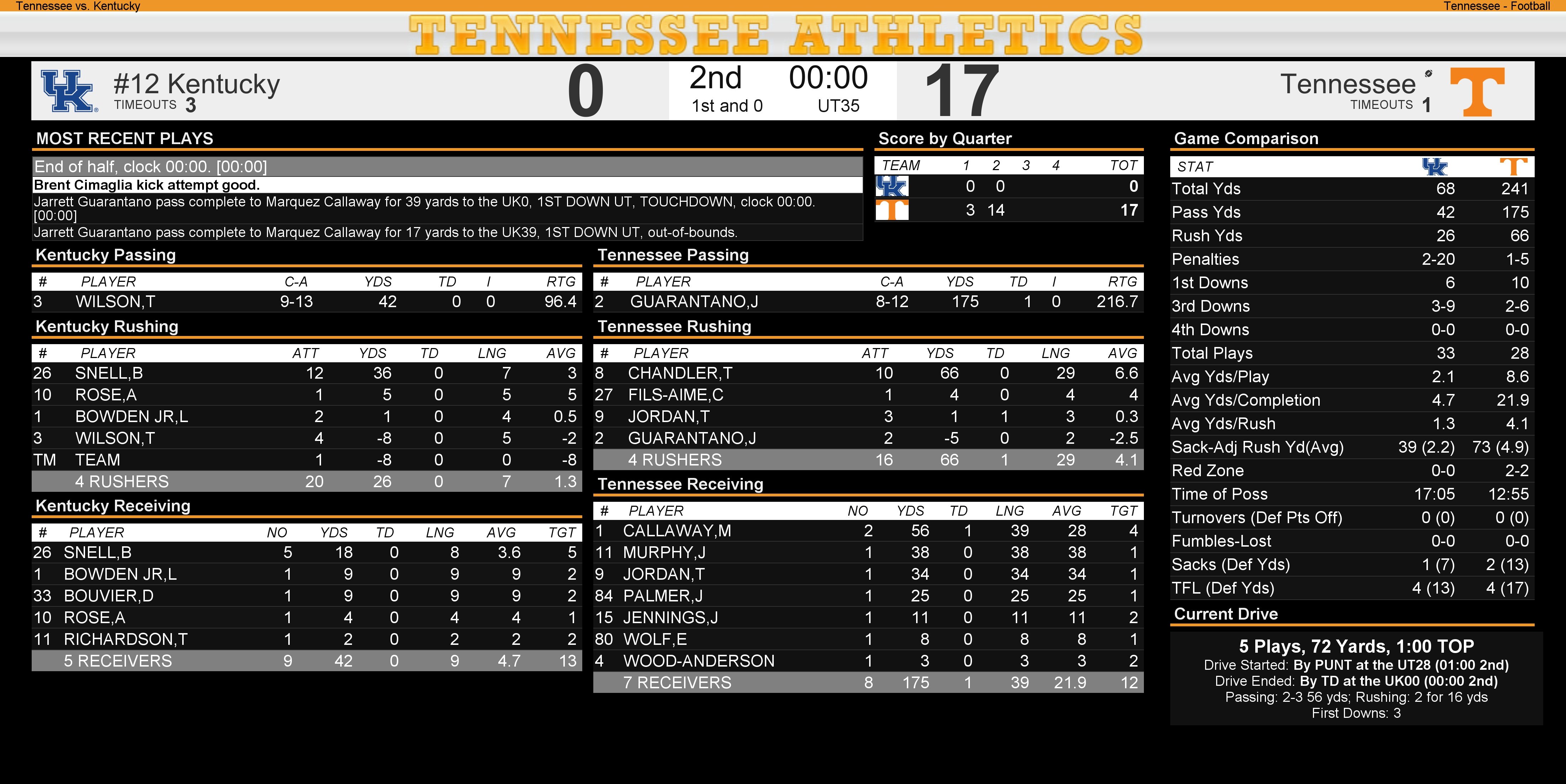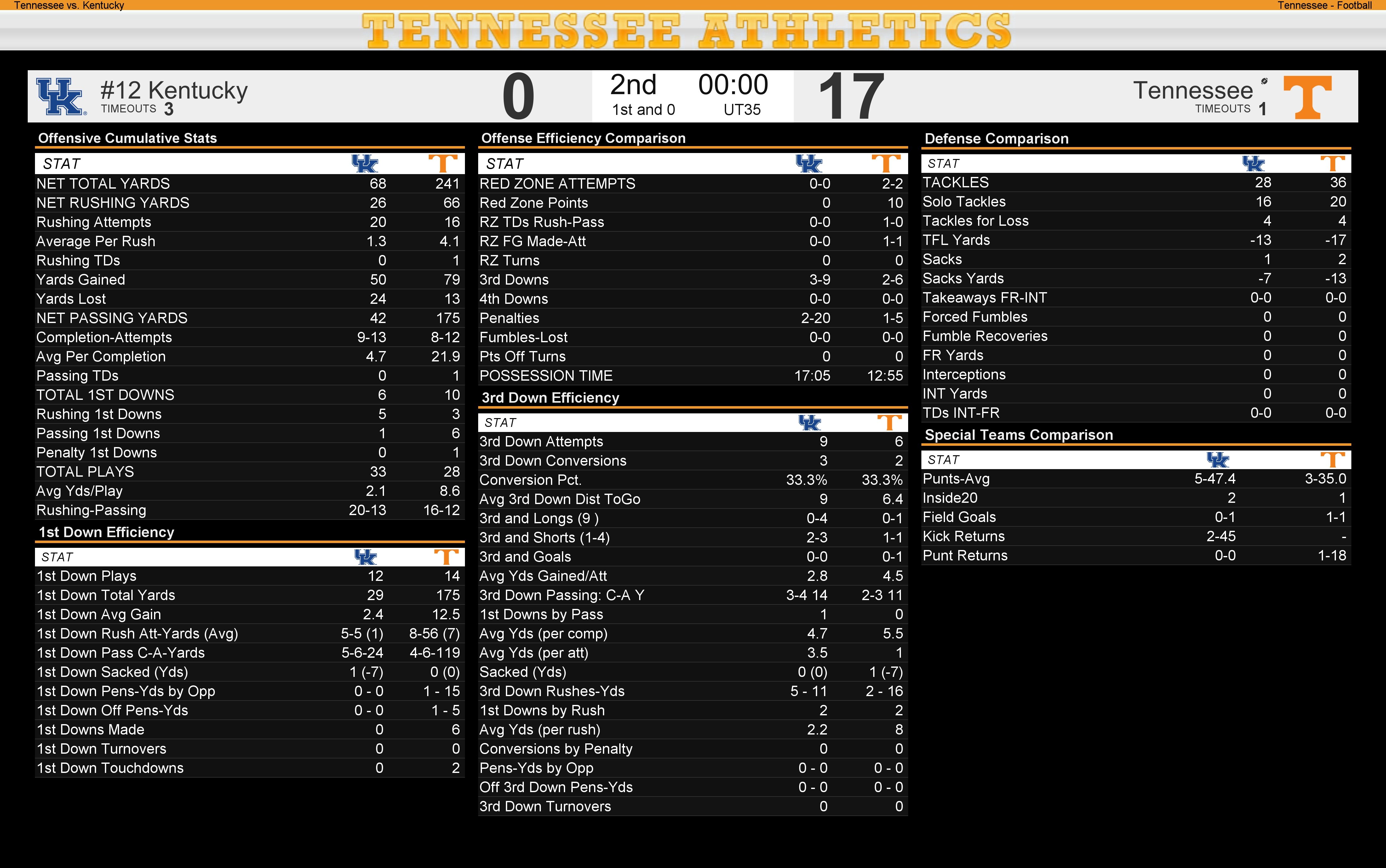Football Halftime Boxscore: Kentucky vs. Tennessee By Chad Pugh Posted on Nov 10, 2018 Share Tweet Share Share Email Comments Kentucky trails Tennessee 17-0 at halftime. Here is a look at the first half stats: Related Items:BBN, Halftime Boxscore, kentucky football, mark stoops, sec football, tennessee football Share Tweet Share Share Email