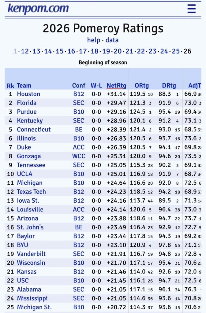The initial 2026 Pomeroy Ratings for men’s basketball are out this morning and Kentucky comes in at No. 4.