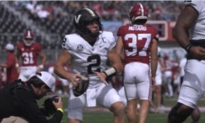 Vanderbilt quarterback Diego Pavia spent some time in pregame practicing victory formation at Alabama...
