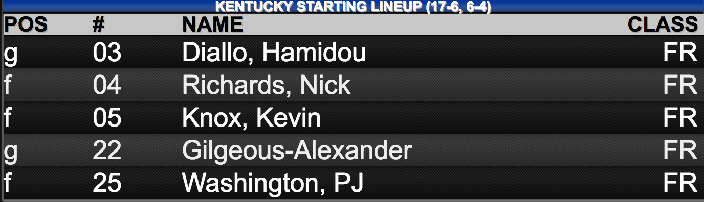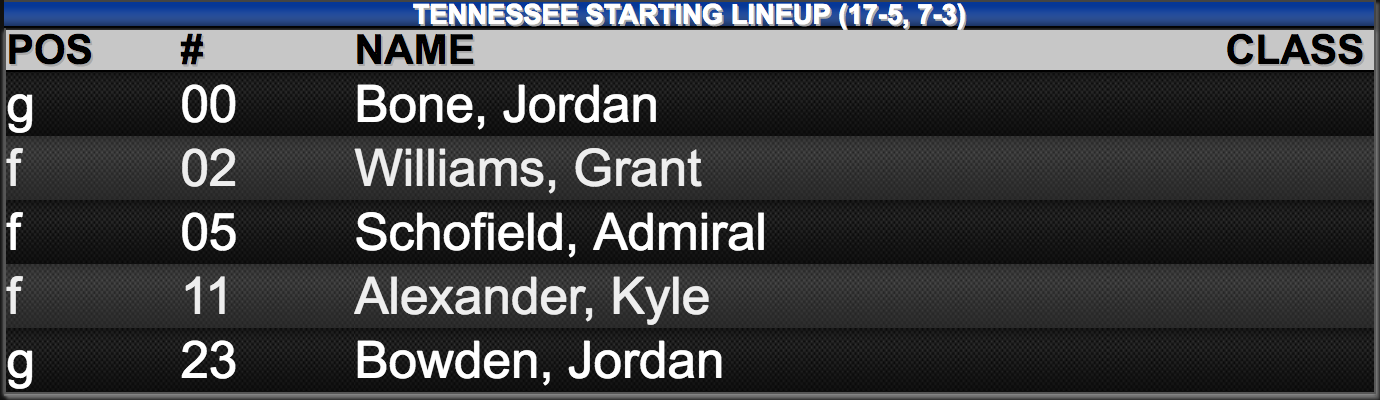 Basketball Starting Lineups: Kentucky vs. Tennessee By Chad Pugh Posted on Feb 6, 2018 Share Tweet Share Share Email Comments Here are tonight’s starting lineups for Kentucky and Tennessee. Related Items:BBN, john calipari, kentucky basketball, rick barnes, starting lineups, tennesee basketball Share Tweet Share Share Email