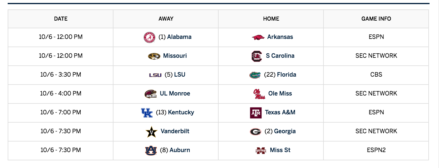 Football Week 6 SEC Football Schedule By Chad Pugh Posted on Oct 6, 2018 Share Tweet Share Share Email Comments Here is a look at today’s SEC football schedule and where you can watch each game. Related Items:BBN, kentucky football, sec football Share Tweet Share Share Email