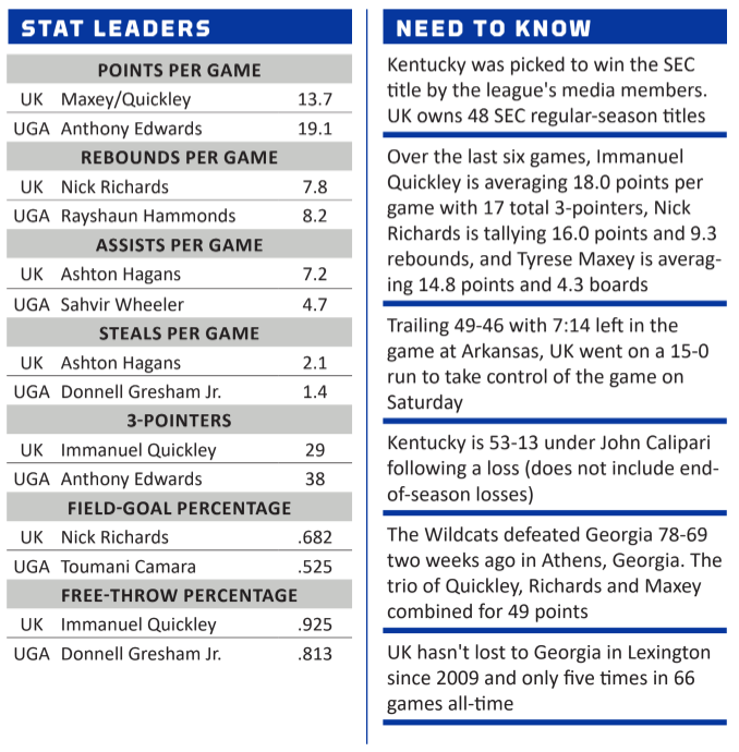 The #15/14 Kentucky Wildcats (13-4, 4-1) host the Georgia Bulldogs (11-6, 1-3)in Rupp Arena tonight at 7:00 pm on ESPN.